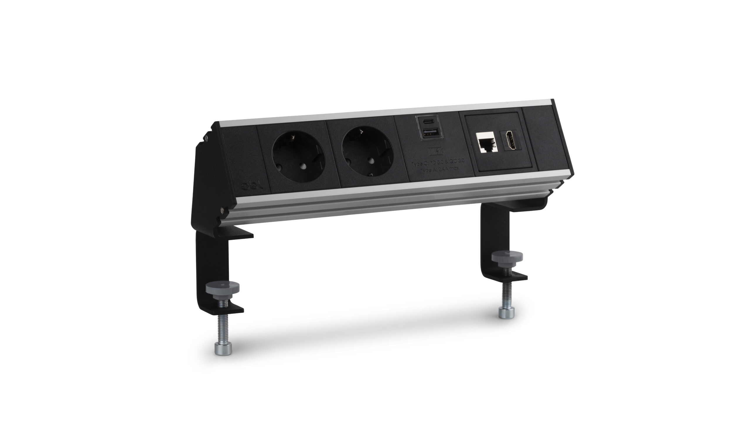 A practical and stylish addition to any desk. Flexi can be manufactured to any configuration with a variety of power socket options and USB dual fast charging A+C ports (35W). This modular system is completely configurable, available in up to six UK sockets, USB dual A+C fast charging sockets, and media connections. The metal side caps with clamps give this product an elegant touch and enable easy installation.